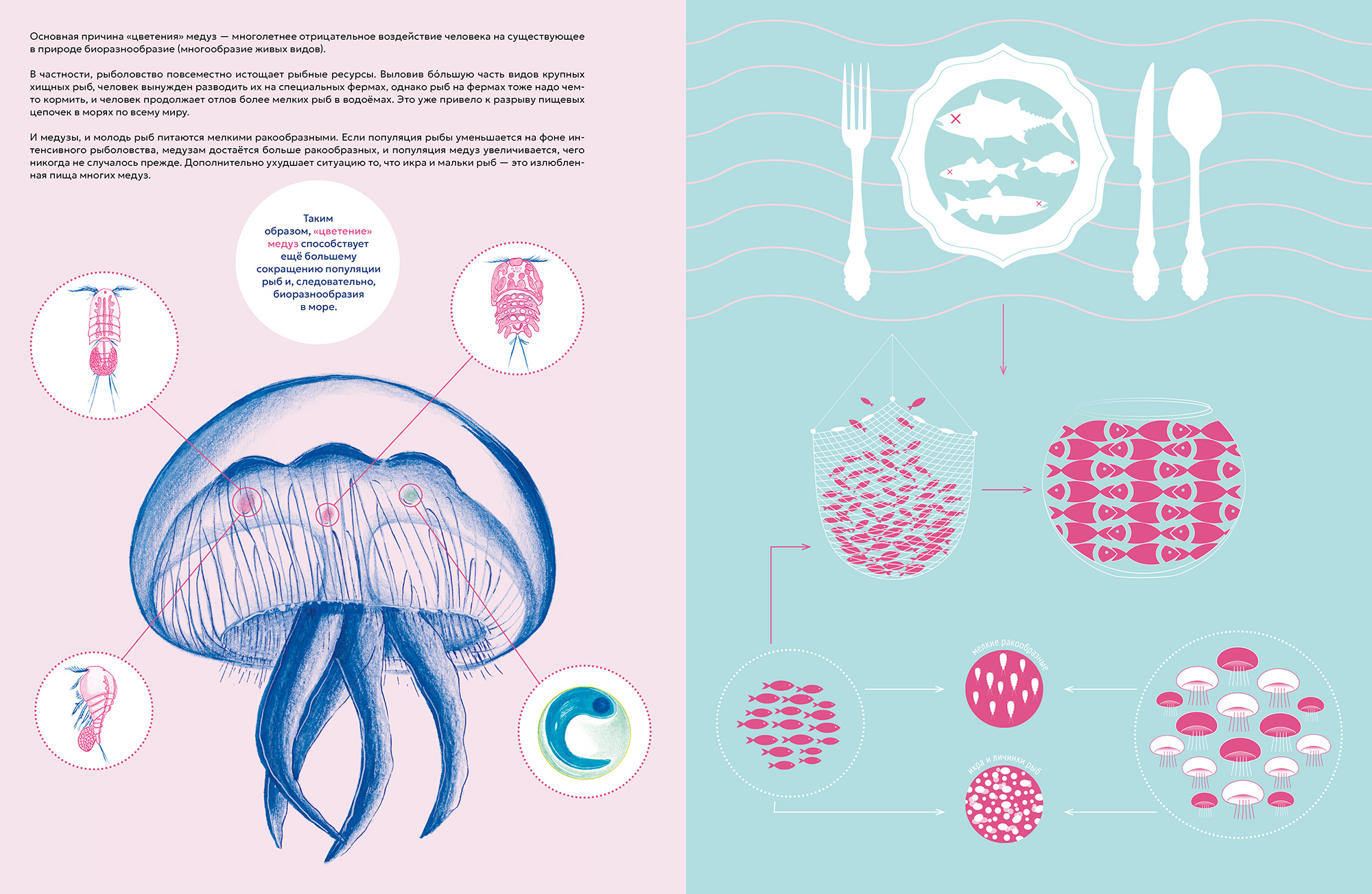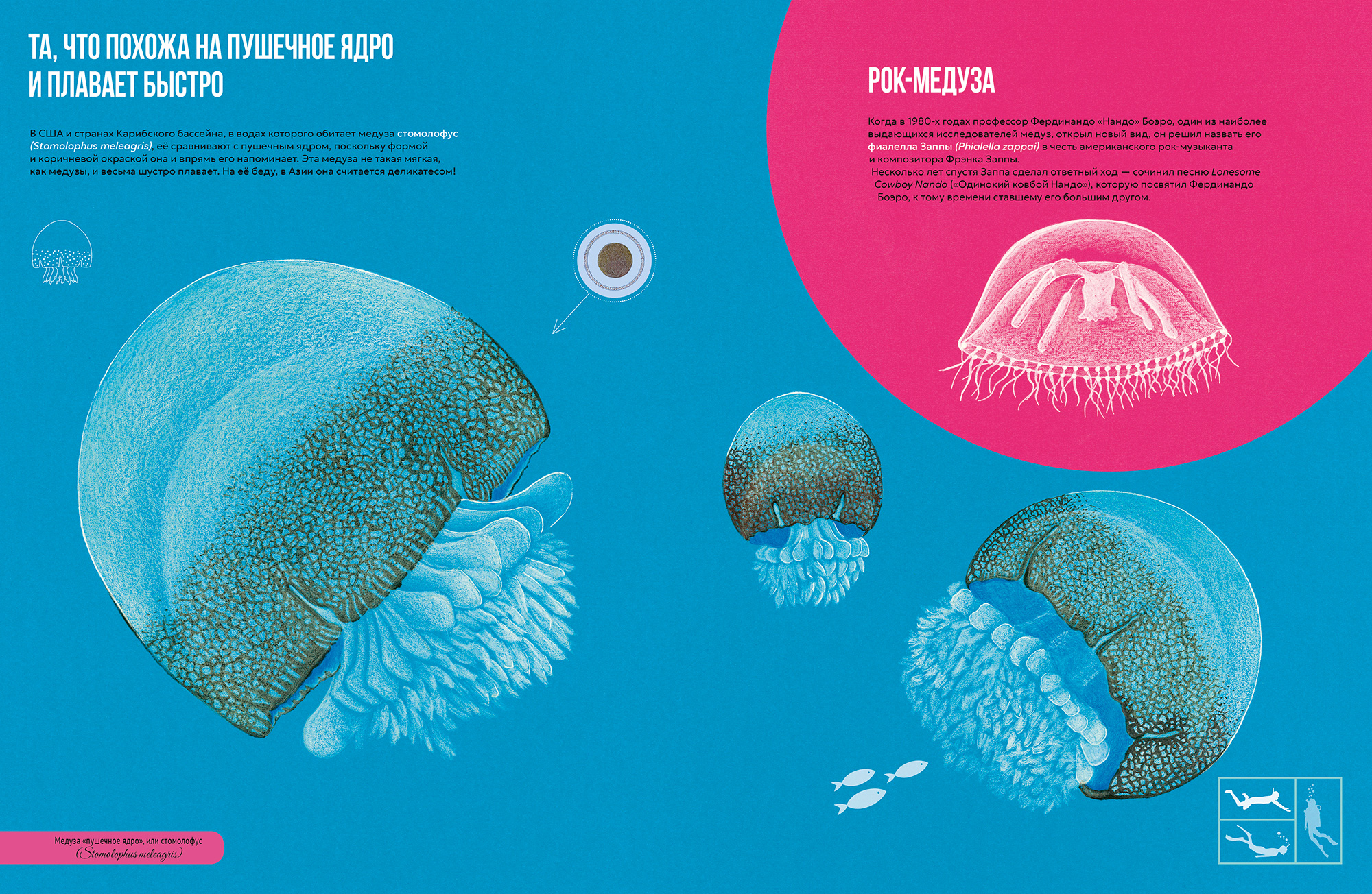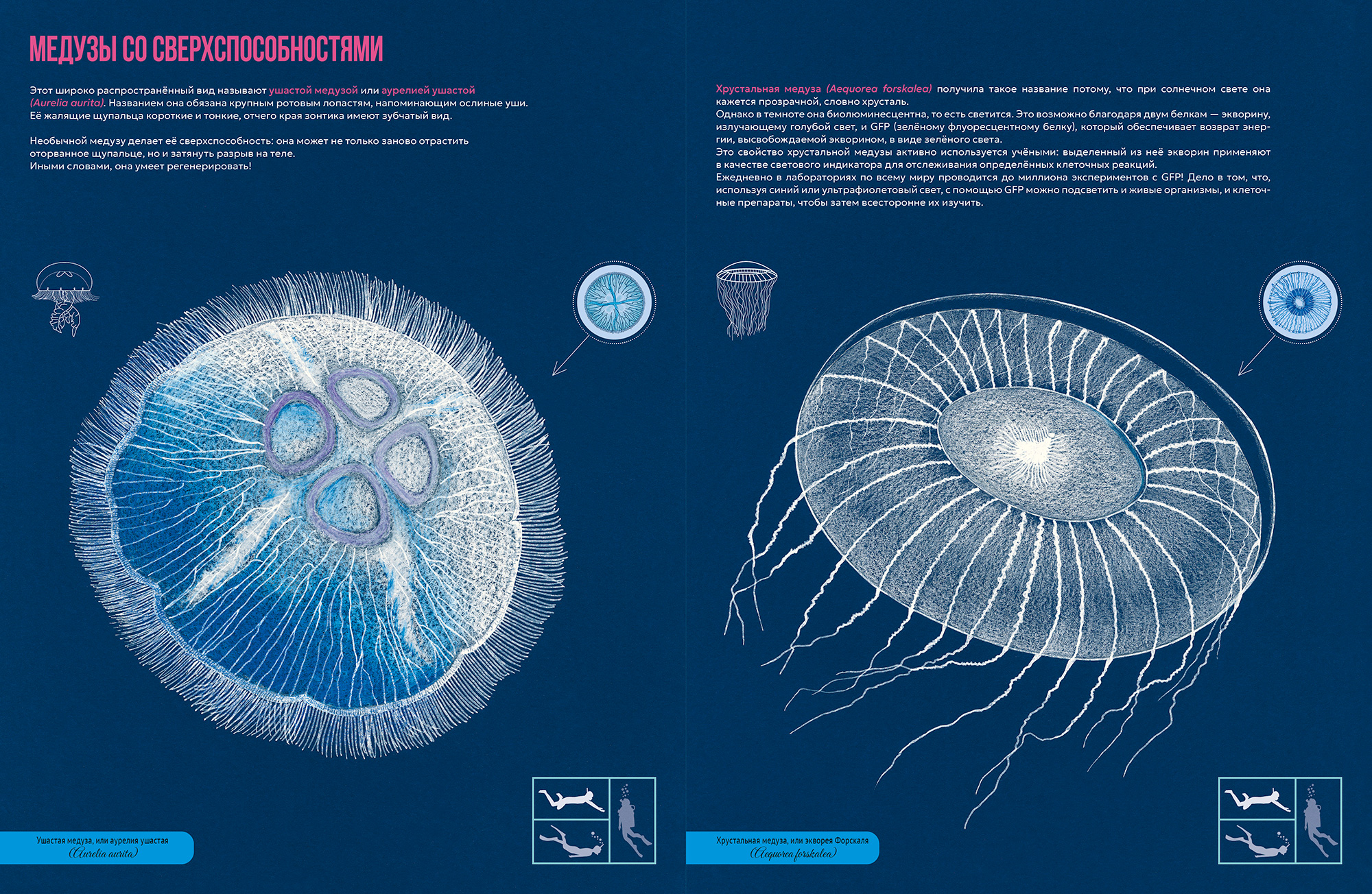 — Мы с Паолой работали в тесном диалоге. Изначального, неизменного текста не было — он жил и развивался в процессе. У меня постоянно возникали вопросы по мере работы над иллюстрациями. Например, я спрашивала: «А где у медуз глаза?» — и мы вместе искали ответ, что иногда требовало от Паолы дополнительных расследований. Этот процесс был взаимным: некоторые детали, родившиеся в иллюстрациях, потом требовали пояснений и в тексте.
