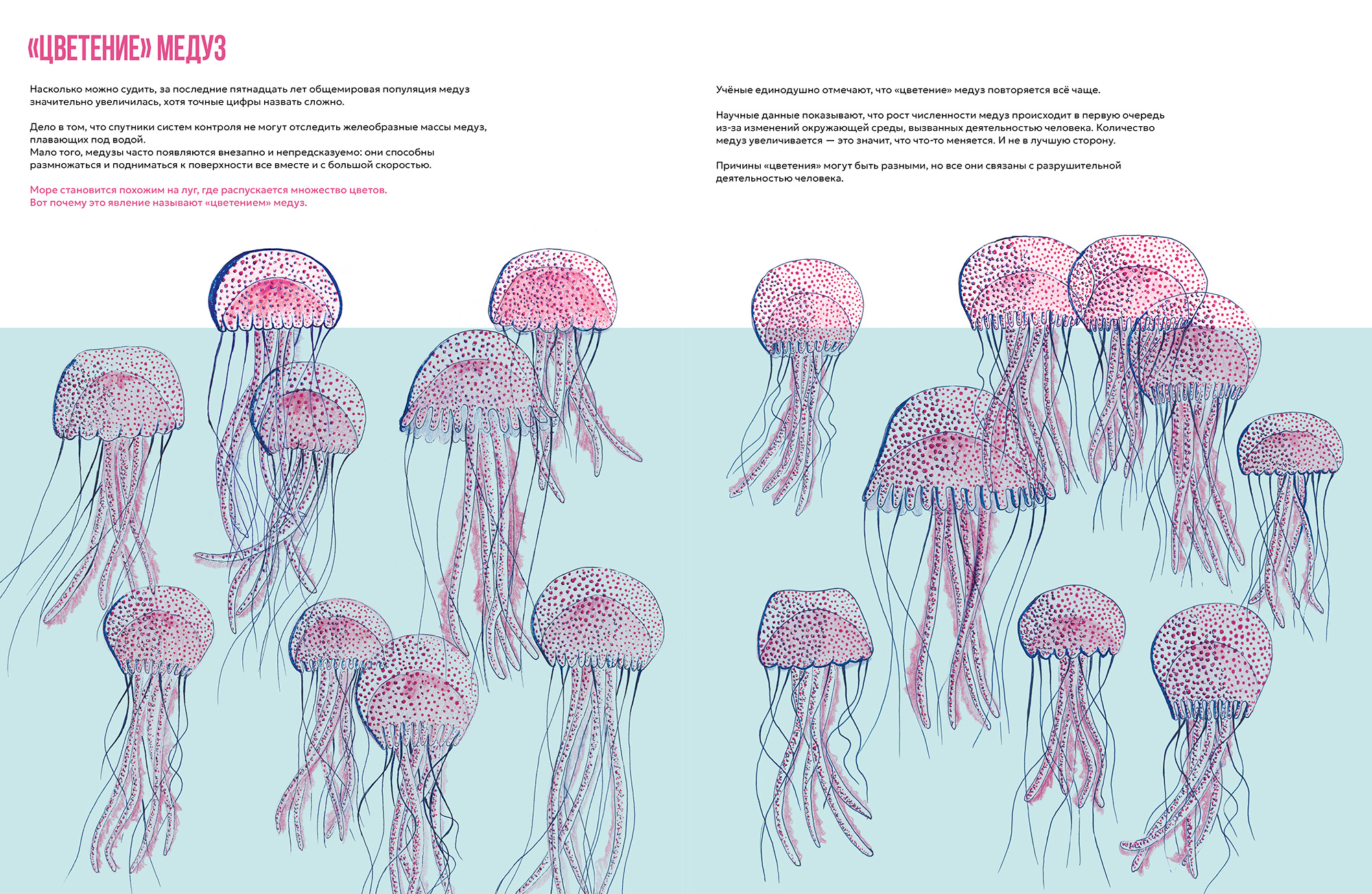 — Идея иллюстрировать книгу о медузах пришла ко мне очень своевременно. Незадолго до предложения от издательства я слушала передачу на Radio3 Scienza, где как раз обсуждали медуз и их роль как индикаторов изменений климата. Эта тема уже меня заинтриговала, так что предложение издательства стало совпадением, которое пришлось очень кстати.
