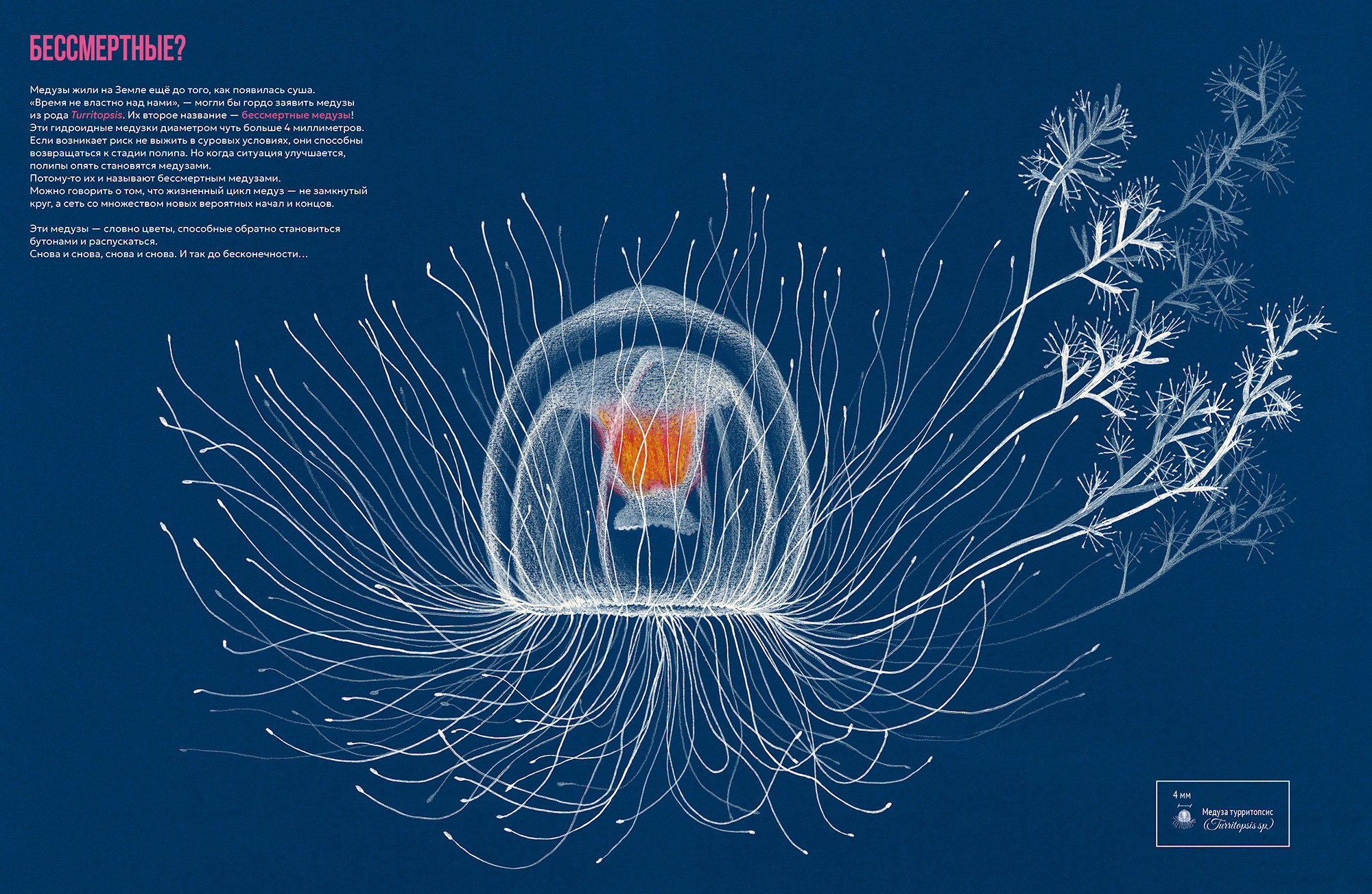 Медузы — одни из древнейших существ на планете. Они появились задолго до нас и выработали феноменальные стратегии выживания, включая способность к регенерации. Когда внимательно всматриваешься в существа, подобные медузам, понимаешь, сколько удивительного мы обычно не замечаем в окружающем мире и как многому нам ещё предстоит у него научиться. Эта книга стала для меня напоминанием о том, что мы — неотъемлемая часть природы, а не её хозяева.